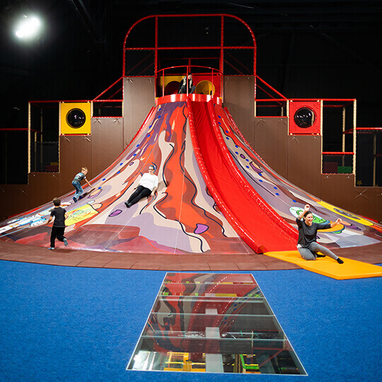 Hochgeschwindigkeitsaction und Nervenkitzel pur – erst der anstrengende Aufstieg, dann die rasante Abfahrt. Um von der Spitze des Vulkans majestätisch auf deine Umgebung zu blicken, musst du 5 Meter hinaufklettern. Nach der Tour erwartet dich die Vulkanrutsche, die dich direkt vor dem riesigen Kiddy Dome-Tiger und dem Soccerfeld herauskatapultiert, wo weitere Abenteuer auf dich warten.