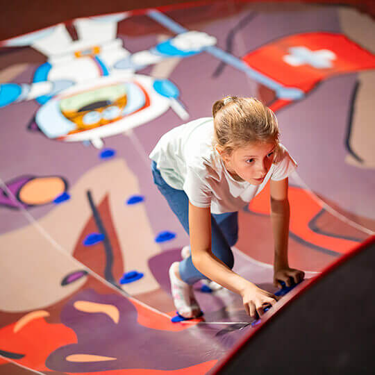 Action à grande vitesse et sensations fortes - d'abord la pénible montée, puis la débauche de gaz en bas. Pour pouvoir contempler sublimement tes sujets depuis le sommet du volcan, tu dois grimper à 5 mètres de hauteur. Après le tour, le toboggan volcanique n'attend que de te recracher juste devant l'immense Kiddy Dome Tiger et le terrain de soccer, où les prochaines aventures t'attendent déjà.
